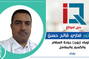 دكتوراه (بورد عربي) جراحة العظام والكسور والمفاصل عضو وزميل الجمعيه العالميه للاصابات والحوادث (سويسرا) عضو وزميل الجمعيه العالميه لجراحة العمود الفقري (سويسرا) دبلوم الاتحاد الاوربي في جراحة العمود الفقري المدينة : بغداد القسم : جراحة العظام والمفاصل والكسور موبايل : 07704355357 العنوان : بغداد – شارع فلسطين – ساحة بيروت – مجاور أشعة الضياء أوقات الدوام : يوميا عدا الجمعة …